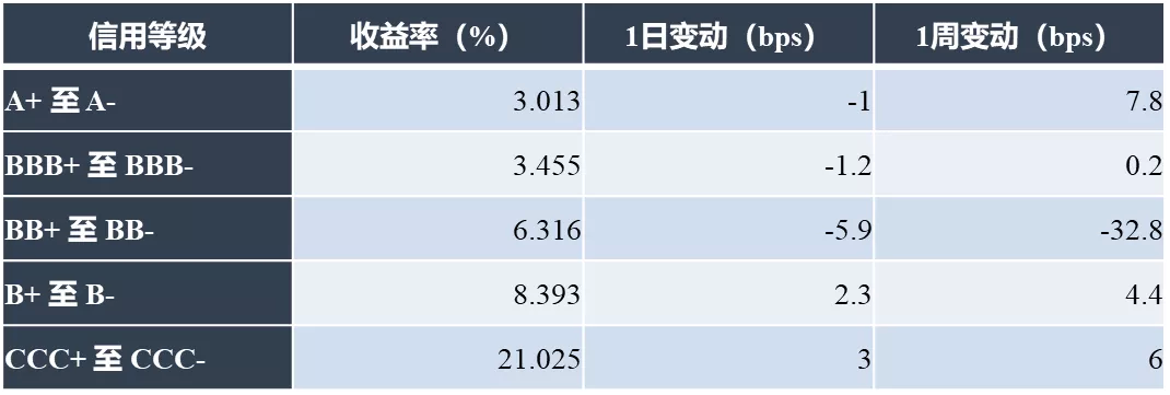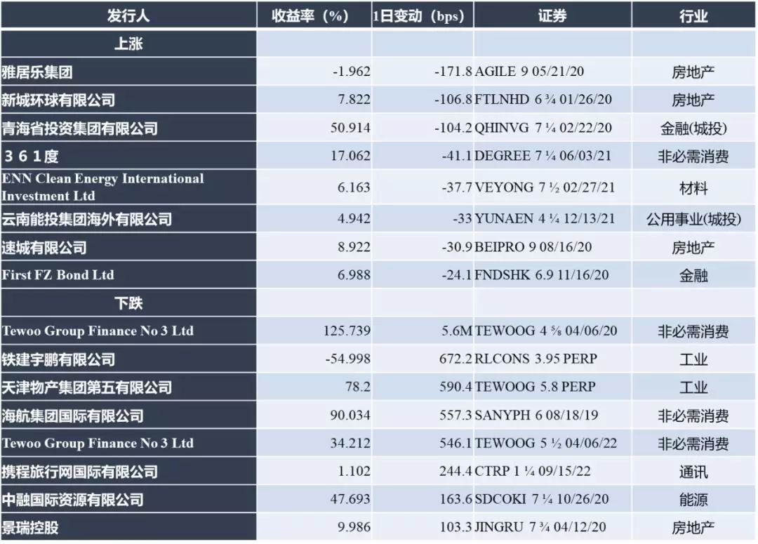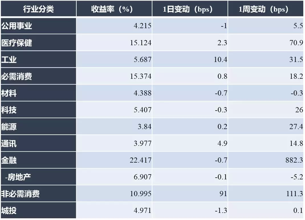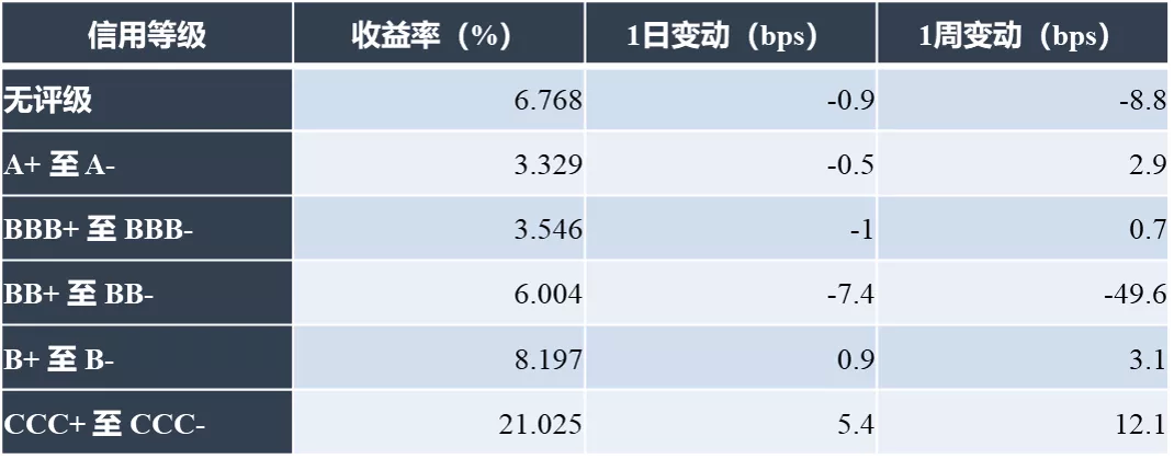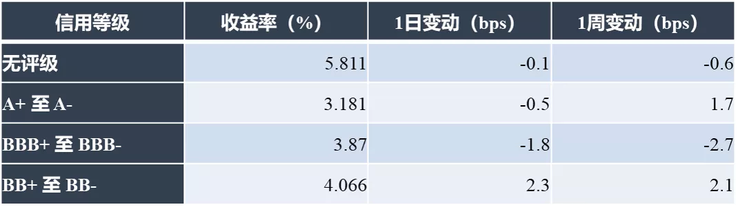 行业方面,城投、公用事业板块小幅领涨,非必需消费、工业板块领跌。城投板块主要受青海省投资集团、云南能投集团等名字上涨的影响,收益率下行约1.3bps;公用事业板块主要受云南能投集团等名字上涨的影响,收益率下行约1bps;非必需消费板块主要受天津物产集团(Tewoo Group Finance No 3 Ltd)、海航集团等名字下跌的影响,收益率上行近91bps;工业板块主要受铁建宇鹏、天津物产集团等名字下跌的影响,收益率上行10.4bps左右。
