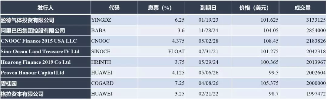 今日交易活跃债券名字YINGDZ 6 ¼ 01/19/23(盈德气体投资有限公司),BABA 3.6 11/28/24(阿里巴巴集团控股有限公司),CNOOC 4 ⅜ 05/02/28(CNOOC Finance 2015 USA LLC)。