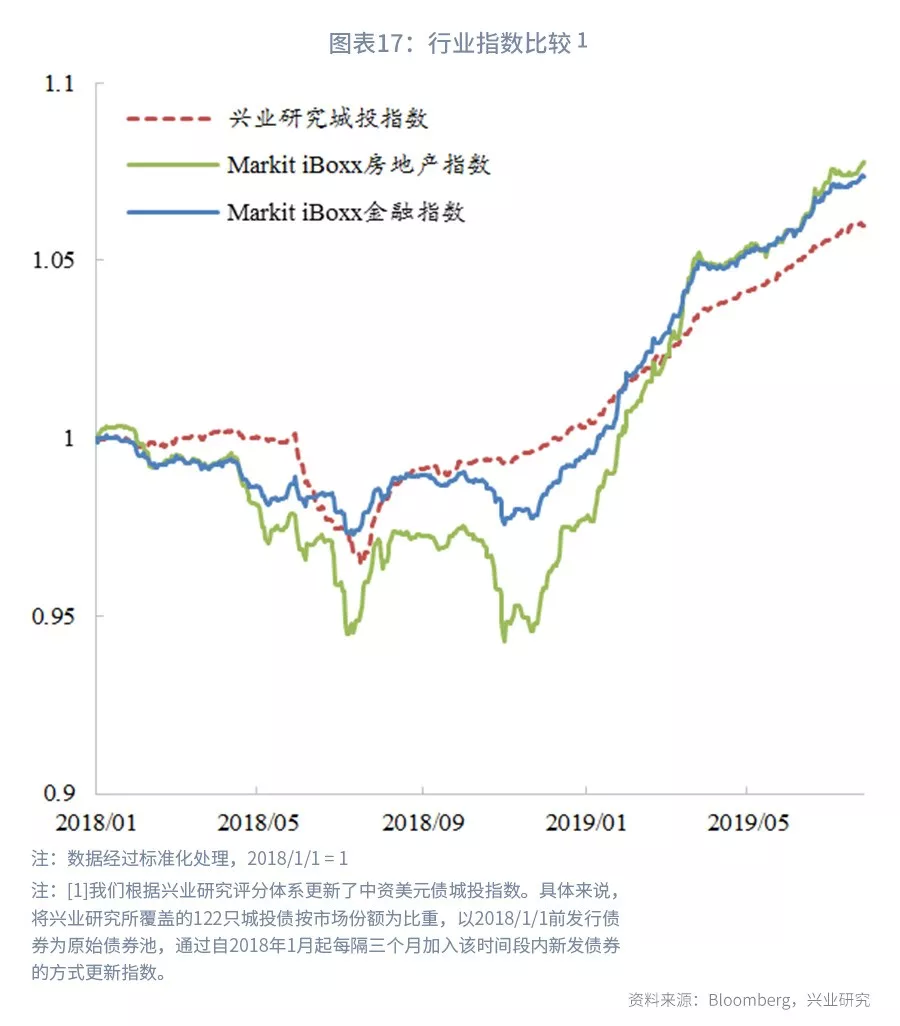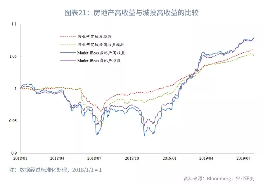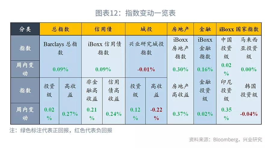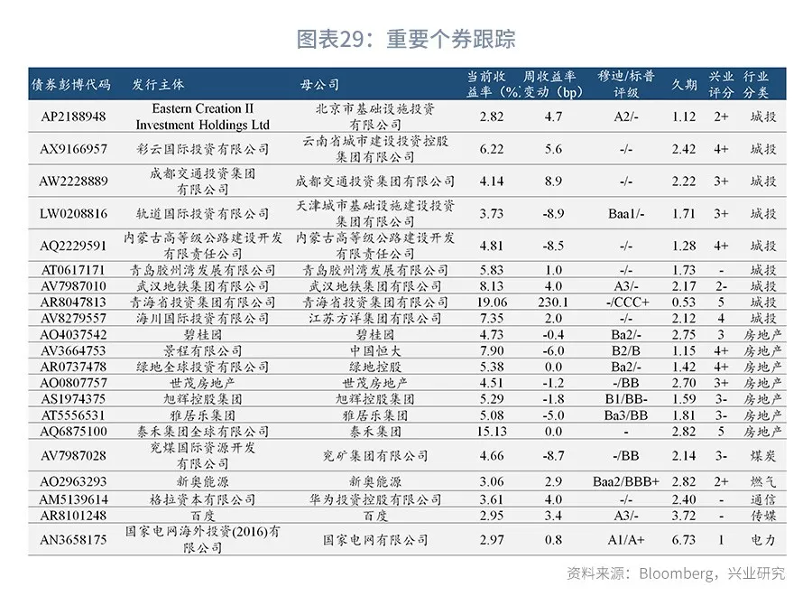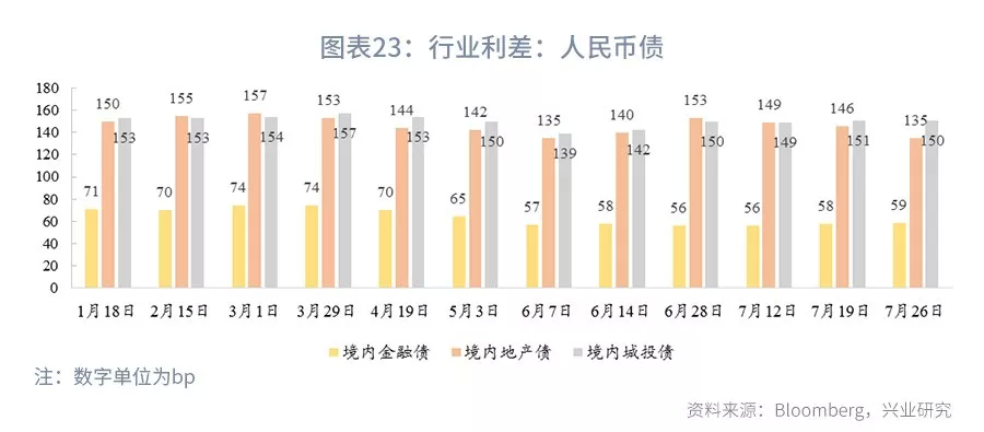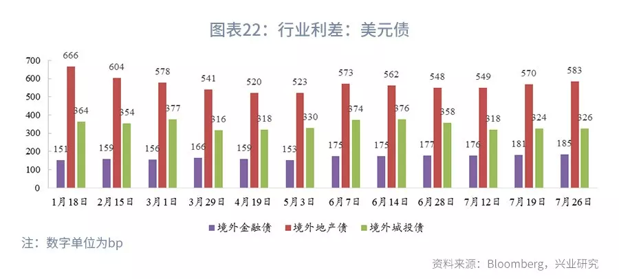 本周行业的境内外利差中地产行业变化较大。境外利差中,金融、地产和城投较上周分别上升3.3bp、上升13.8bp和上升1.6bp。境内行业利差中,本周地产行业利差上升1.1bp,城投和金融的行业利差分别下降10.7bp和0.2bp。