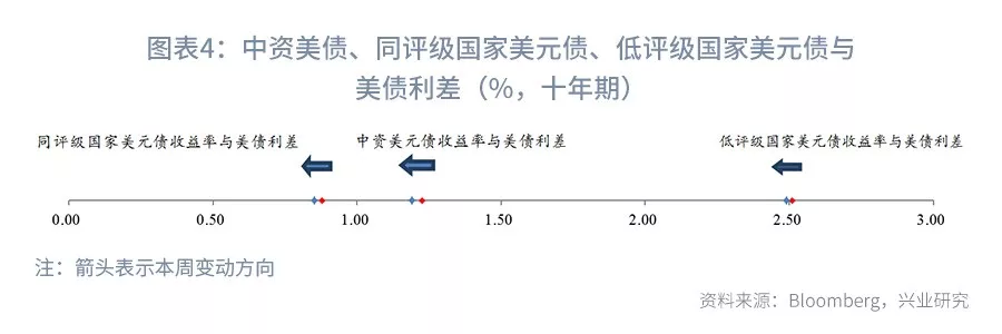 以中资美债为坐标,中资美元债参考收益率曲线与美国国债收益率曲线(10年期)的利差本周缩小2.8bp。中资美元债的参考信用利差(10年期)比同评级国家的参考信用利差缩小0.1bp。中资美元债的参考信用利差(10年期)比低评级可比新兴国家的参考信用利差拉大1.0bp。具体变动方向详见图表2。