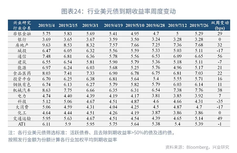 截至美国时间7月19日收盘,2年期美债收益率周度上升3.4bp至1.85%,5年期美债收益率上升3.2bp至1.85%,10年期美债收益率上升1.5bp至2.07%。使用具有一定流动性的样本券估计发现,中资美元债高评级债券的2年期参考收益率上升4.2bp至2.71%,5年期参考收益率上升0.7bp至2.90%,10年期参考收益率下降1.3bp至3.27%;中评级(穆迪评级Ba1至Baa1)债券的2年期参考收益率上升3.7bp至3.21%,5年期参考收益率上升0.9bp至3.43%,10年期参考收益率下降1.9bp至3.78%;低评级和无评级(穆迪评级Ba2及以下)债券的2年期参考收益率下降5.7bp至6.02%,5年期参考收益率下降11.4bp至4.48%,10年期参考收益率上升17.3bp至3.32%。具体收益率变化详见图表3。