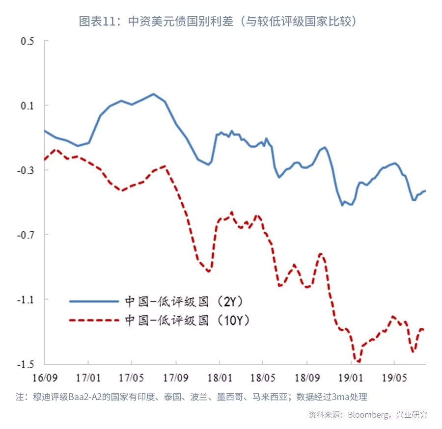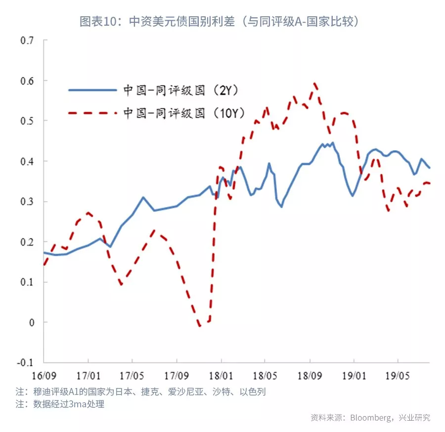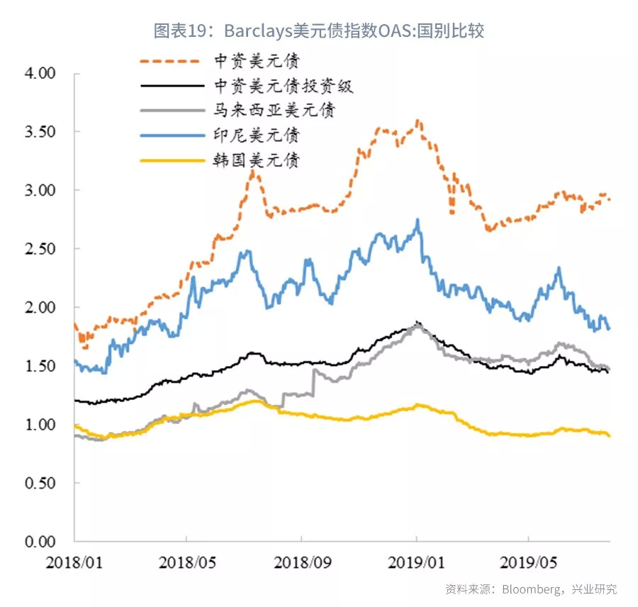 国别利差方面。根据穆迪A3以上投资级样本券情况,我们估计了一条中资美元债的参考收益率曲线。收益率排序上,可比新兴国家美元债>中资美元债>同评级国家美元债>美债。本周中资美元债和同评级国家美元债与美债利差分别缩小2.8bps和2.7bps,可比新兴国家美元债与美债利差缩小1.8bps。