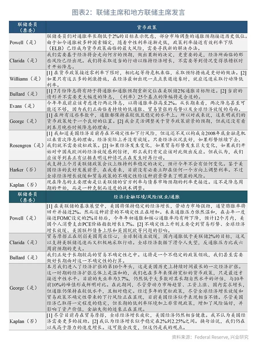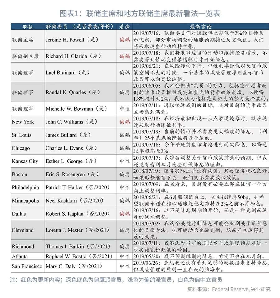 联储7月例会将于美国东部时间本周二和周三召开。联储会议前夕为惯例下的“噤声期”,因此上周没有联储官员发表公开谈话。本次例会降息几乎已成定局,目前市场已充分消化了月末降息25bp的预期。重点在于此轮降息的幅度,究竟美联储是选择降息25bp还是50bp。7月18日,纽约联储主席Williams的公开发言被解读为可能会有更为积极的政策行动,市场对于降息50bp的预期大幅提升。随后,纽约联储罕见地“官方再解读”Williams的言论,市场随之对降息两次的预期转低。联储所传递的混乱信息,导致市场短时间内对降低的预期大幅波动,遭到了市场人士的普遍批评。虽然沟通出现了一些混乱,但多数联储委员所释放的鸽派信号还是较为明确。除一直坚持降息的大鸽派圣路易斯联储主席Bullard外,多数中性立场的联储委员也纷纷加入了鸽派阵营。从近期的发言来看,今年上半年联储委员所惯用的“耐心”、“观察数据”、“运转良好”及“处于中性利率的估计范围内”等措辞几乎消失,转而强调“宽松的政策”和“维持经济扩张”的目标。