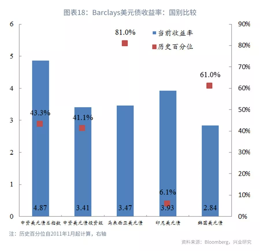 新兴国家投资级美元债指数变化不大,印尼债指数依然表现强劲。本周印尼债投资级指数上升0.35%,马来西亚没有变化,韩国下降0.04%,中国上升0.02%;最近六个月的指数回报分别为:韩国4.90%,马来西亚6.31%,中国5.60%,印尼9.66%。这四个国家美元债市场当前参考收益率分别为:韩国2.84%,马来西亚3.46%,中国4.87%,印尼3.93%。收益率的历史百分位(当前收益率高于09年以来收益率的概率)分别为:韩国61.0%,马来西亚81.0%,中国43.3%,印尼6.1%。