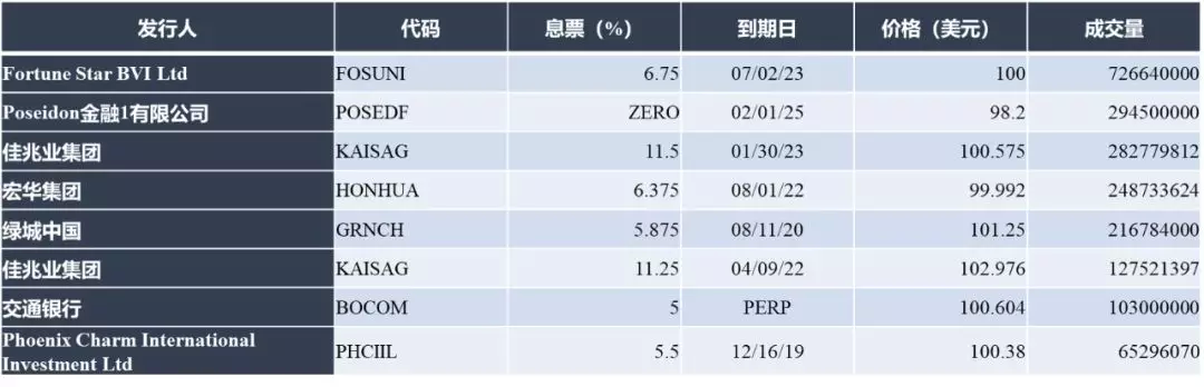 今日交易活跃债券名字FOSUNI 6 ¾ 07/02/23(Fortune Star BVI Ltd),POSEDF 0 02/01/25(Poseidon金融1有限公司),KAISAG 11 ½ 01/30/23(佳兆业集团)。