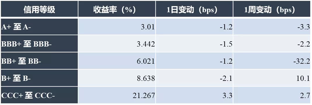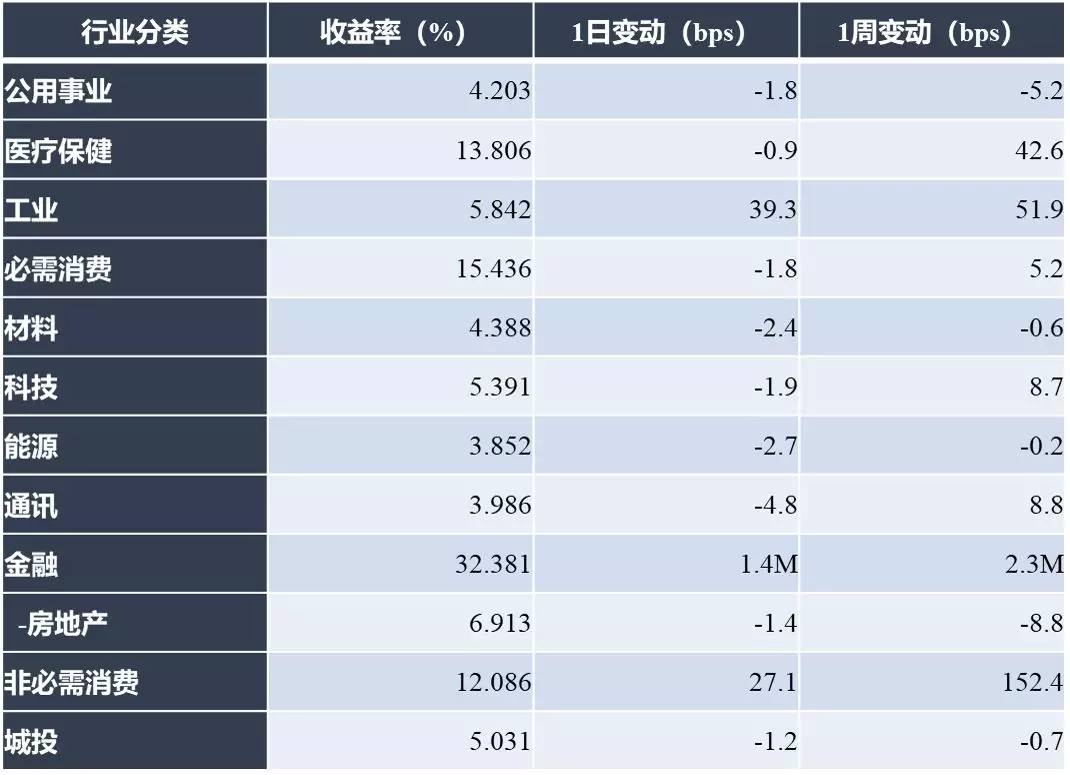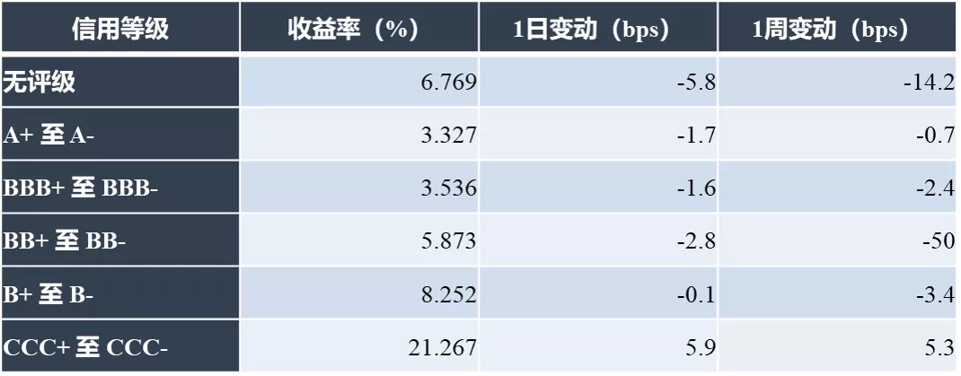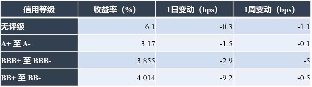 一级市场德信中国、中国奥园定价。二级市场受无评级名字影响大幅走弱,投资级名字小有上涨,高收益名字涨跌不一;行业方面,通讯、能源板块小幅领涨,金融、工业、非必需消费板块领跌。
