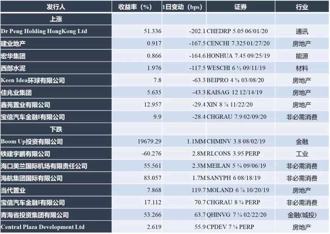 行业方面,通讯、能源板块小幅领涨,金融、工业、非必需消费板块领跌。通讯板块主要受鹏博士(Dr Peng Holding HongKong Ltd)等名字上涨的影响,收益率下行约4.8bps;能源板块主要受宏华集团等名字上涨的影响,收益率下行约2.7bps;金融板块主要受Boom up投资(其债券CHMINV 3.8 08/02/19预计不会如期兑付)等名字下跌的影响,收益率上行近1400bps;工业板块主要受铁建宇鹏等名字下跌的影响,收益率上行39.3bps左右;非必需消费板块主要受海航系公司(7月29日海航集团境内债16海航02债券发生违约)、宝信汽车金融I有限公司等名字下跌的影响,收益率上行约27.1bps。