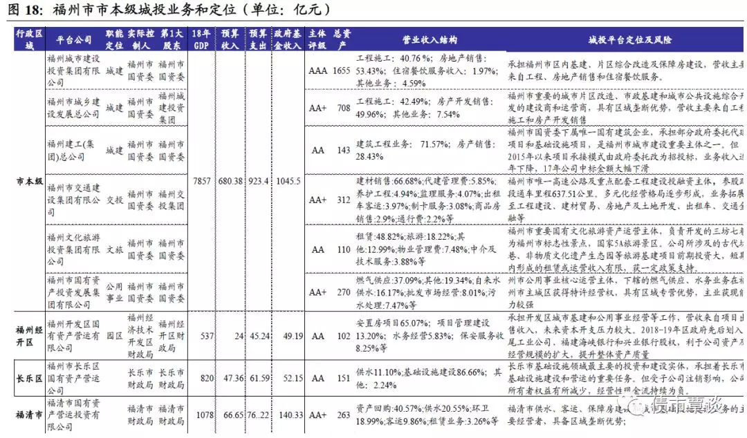 福州经济技术开发区:中国首批14个国家级经济技术开发区之一,16年成为首个涵盖国家级新区、自由贸易试验区、海上丝绸之路核心区、两岸经济合作示范区及国家级开发区的“五区叠加”重点区域,18年GDP为537亿,增长8%,工业固定资产投资增长48.1%,一般预算收入24亿,预算支出45.24亿,政府性基金收入49.19亿,增长16.1%,政府债务余额为78.94亿。区内唯一核心平台是福州开发区国有资产营运有限公司,承担开发区城市基础设施建设和公用事业经营等工作,营收主要来自项目出售收入,截止18年末在建工程总投资75.58亿,尚需投资40.51亿,存在较大资金支出压力。2018-19年,区政府先后划入马尾工业公司、福建海峡银行和兴业银行股权,利于公司资产及经营规模的扩大,提升整体资产质量。已用银行授信3.97亿,无未用额度。