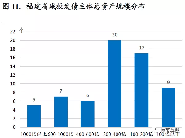 从全省整体城投平台总规模来看,1000亿元以上的有5家,资产在600-1000亿的有7家,资产在400-600亿的有6家,资产在200-400亿的数量最多达20家,100-200亿有17家,100亿以下有9家,资产规模在400亿以下的城投发债平台数量占比达72%。