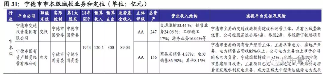 宁德市本级城投平台共有2家。宁德市交通投资集团有限公司为宁德市主要的交通设施投资建设和运营主体,具有区域垄断优势。公司控股高速公路4条、参股2条,参股衢宁铁路项目,在建拟建项目总投资54.12亿,尚需投资48.27亿。18年受限资产17.88亿,占资产比8.02%;获银行授信257.12亿,未使用153.64亿;对外担保1.26亿,担保率1.45%。