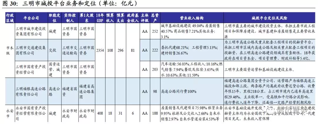 永安市:三明市下辖县级市,18年GDP为427.76亿元,同比7.7%;人均GDP为11.9万元,高于全国均值1.85倍,固定资产投资额同比9.3%。一般预算收入18亿,增长2.4%,税收占比仅59.3%,财政支出30.92亿,财政自给率58.34%;政府性基金收入6.49亿,增长6.02亿。市内唯一核心平台为永安市国有资产投资经营有限责任公司,为永安市基础设施开发投资主体,永安市其他主要基建投融资主体均为永安国投下属的全资或控股子公司。代建项目充足,未来收入有保障,在建项目预计投资69.61亿,尚需投资54.9亿,融资压力大;此外,公司还经营交通服务、粮食购销等公益性业务。18年末对外担保28.92亿,担保率32.25%。