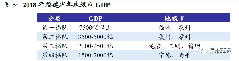 按经济总量看,如果将福建省经济分为4个梯队,则泉州市、福州市处于第一梯队(GDP在7500亿以上),泉州市2018年GDP达8467.98亿,连续20年位居省内各市首位,福州作为全省政治、经济和文化中心,GDP在7856.8亿,排名次之;厦门市、漳州市在第二梯队,经济总量在3500-5000亿元的区间,厦门市是计划单列市,而漳州市在厦漳泉大都市区战略带动下,经济实力也相对较强;第三梯队GDP在2000-2500亿区间,包括龙岩、三明和莆田;而宁德市、南平市GDP在2000亿以下,经济总量相对较弱,属于第4梯队。