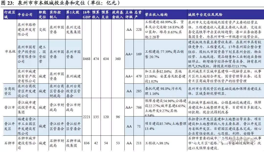 泉州市国有资产投资经营有限责任公司(泉州国资),建筑板块为最主要营收来源,由子公司福建五建负责,截止18年3月在建工程87个,总造价123.4亿,在泉州市具有较强竞争力,未来工程量充足。17年泉州国企整合重组后,股权从市国资委下划至泉州金控,并将泉州国投资管、中侨集团、展览城、产业股权公司等划出集团,相应物业经营、土地改造、商品销售和工业制造业务也相继停止,新增楼宇经济和贸易业务。公司持有泉州燃气32%股权,持股泉州银行13.77%,截止18年3月,获银行授信125.61亿,未使用79.39亿;受限资产9.39亿,占总资产5.49%;对外担保25.95亿,担保率49.78%。