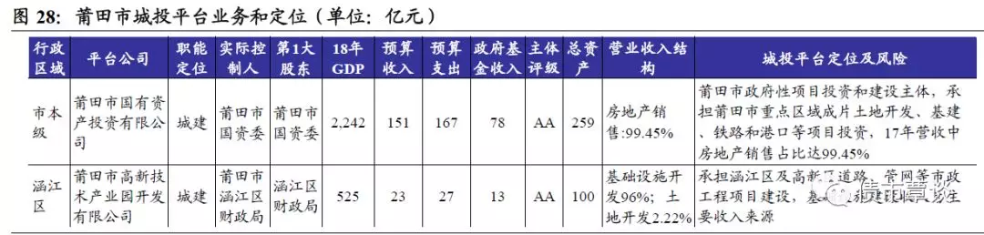 涵江区:18年GDP为524.54亿,增长8%,固定资产投资328.45亿;三次产业结构为2.8:65.6:31.6,高新区聚集企业407家,年产值超亿元企业112家,实现工业总产值781.3亿,增长11.2%;高新区以电子信息、食品加工、装备制造为3大主导产业。区内唯一平台为莆田市高新技术产业园开发公司,承担涵江区及高新区道路、管网等市政工程项目建设,基础设施建设收入为主要收入来源,占营收比96.14%。截止18年末在建项目总投资12.76亿,已投资4.74亿,拟建项目7.33亿;获银行授信26亿,尚未使用11.17亿;对外担保14.65亿,担保率26.65%。