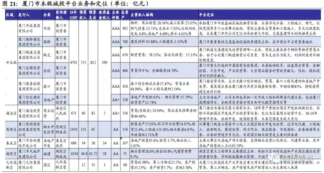 思明区:厦门市经济、政治、文化、金融中心,经济总量在厦门市各区首位,以商务、商贸、旅游、房地产为4大支柱产业,面积84平方公里。18年GDP为1449.9亿元,增长7.2%,固定资产投资191.73亿元,同比下降19.7%。全区实现财政收入134.28亿元。区内唯一发债城投是厦门思明国有控股集团,主要从事厦门观音山商务中心及工业园区的物业开发与经营,此外还涉及代建、工程施工、旅游观光、早教培训、展馆运营、环卫作业、酒店服务、市政园林管养、会务接待等业务,公司业务经营逐步多元化,目前园区物业租赁是主要利润来源。2018年公司资产总额为110.07亿元。目前在建项目计划投资111.5亿,已完成57.67亿;受限资产规模较大;无担保。