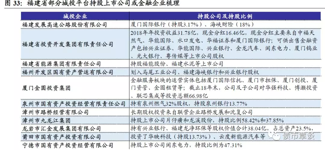 福建省地级市不少城投平台向市场化方向转型进展较快,经营性业务和资产占比高,并持有不少长期股权投资,其中不乏一些优质上市公司和金融企业,可以获取稳定投资收益,提高资产质量,我们对部分持有上市公司或金融企业的城投主体进行梳理如下: