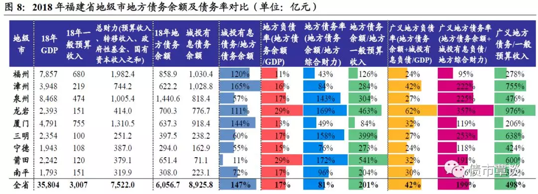 从地方债务率水平看,以“地方债务余额/GDP”衡量的地方负债率全省平均在17%,龙岩市、莆田市相对较高,均为29%,其余地市均在20%以下;以“地方债务余额/地方综合财力”衡量的地方债务率,全省总量在81%,莆田市、龙岩市、三明市在150%以上,相对偏高,福州市、厦门市最低,不到50%;如果仅以“地方债务余额/地方一般预算收入”这一最狭义口径来看,则莆田市、龙岩市、三明市、泉州市这一比例均超过300%,厦门市最低,仅占84%。
