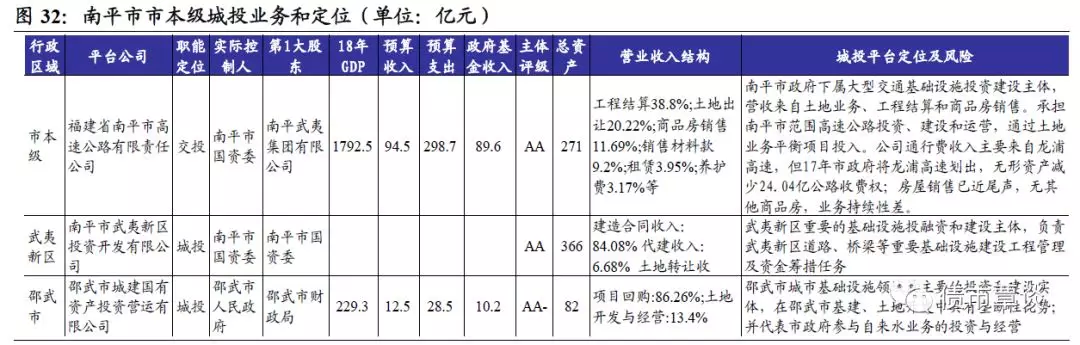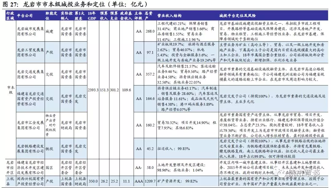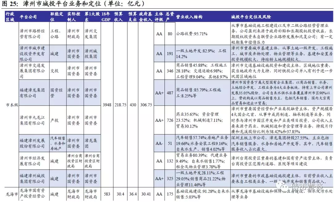 龙海市:位于九龙江出海口,全市面积1128平方公里。2018年GDP为563.79亿元,同比8.3%,固定资产投资268.9亿元,同比10.5%,房地产投资猛增84.4%;一般预算收入30.4亿元,同比0.42%;政府性基金收入为30.41亿,财政自给率49.79%,地方债务余额54.74亿。龙海市内唯一城投平台为龙海市国有资产投资经营有限公司,主要从事龙海市基础设施和保障性住房建设、供水及污水处理等业务,其中基础设施建设收入占比91%。重点在建项目计划投资143.97亿,尚需投资109.15亿;保障房计划投55.68亿,尚需投42.8亿,资金支出压力大。