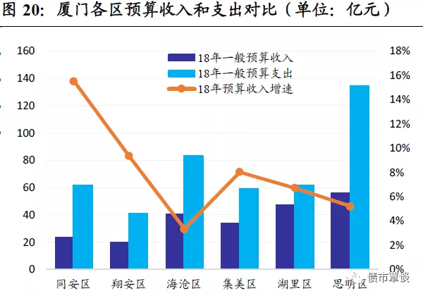 集美区:位于厦门市西北部,集美区汽车、机械、水暖厨卫产业链产值超百亿,为海西重要机械产业制造基地,软件信息服务业发展势头迅猛。2018年全区GDP实现686.22亿,增长7.8%,固定资产投资增长21.4%;预算收入33.78亿,同比8%,政府性基金收入34亿,下降13.46%,预算支出58.48亿,财政自给率为57.76%。区内厦门市杏林建设开发有限公司,主要从事区内房地产项目销售、自持物业运营以及拆迁、代建等业务,其中房地产销售收入占比93.59%。