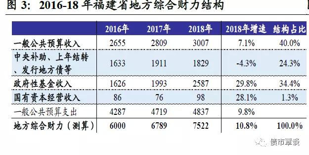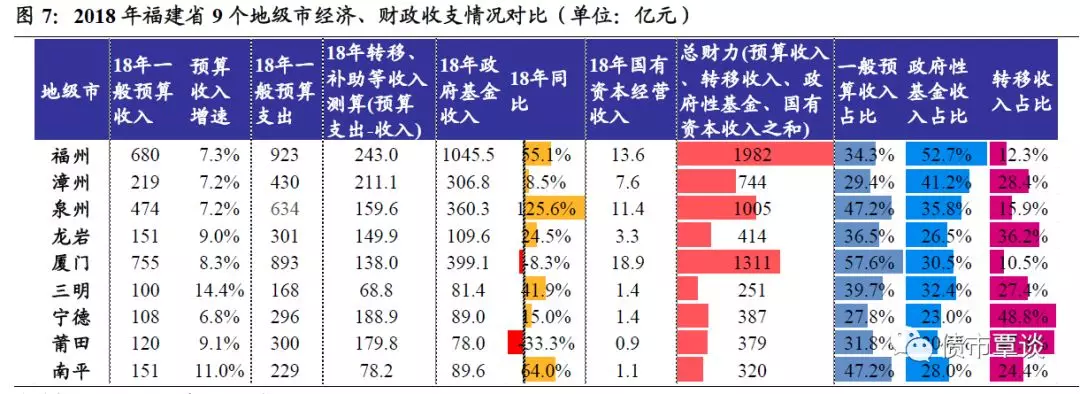 从地方综合财力和来源结构看,①省会福州市排名第一,地方综合财力测算值为1982亿,其次为厦门市、泉州市,综合财力在1000亿以上,而三明市最低不足300亿;②除福州市外,其余地市2018年政府性基金收入规模均未超过一般预算收入,对土地出让收入依赖性较小;③从一般预算收入占综合财力之比看,厦门市、泉州市财政自给率高,一般预算收入占比45%以上,宁德市、漳州市相对较低,占比低于30%;福州市、漳州市对土地出让收入依赖性较高,政府性基金收入占比最高,达到40%以上;而宁德市、莆田市综合财力则更多依赖上级补贴、转移支付和发地方债等,转移收入占到45%以上。