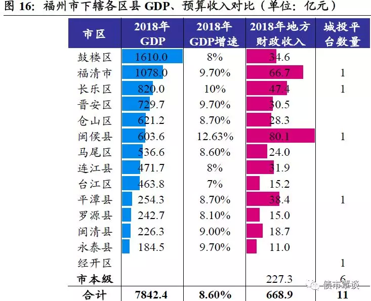 福州市为福建省省会,福建省政治、经济、文化、交通中心,是东南沿海重要的贸易港口和海上丝绸之路门户,也是中国(福建)自由贸易试验区的三片区之一,综合经济实力省内排名第2。面积1.19万平方公司,常住人口774万人,下辖6区7县。2018年GDP为7856.81亿元,增长10.6%,实际增速为8.6%,人均GDP为102037万元,固定资产投资额同比增长11.7%;一般预算收入680.38亿,预算支出923.41亿,政府性基金收入1045.46亿,猛增55.1%;地方债务限额和余额为999.63亿和858.89亿,其中市本级429亿、县市区429.7亿。