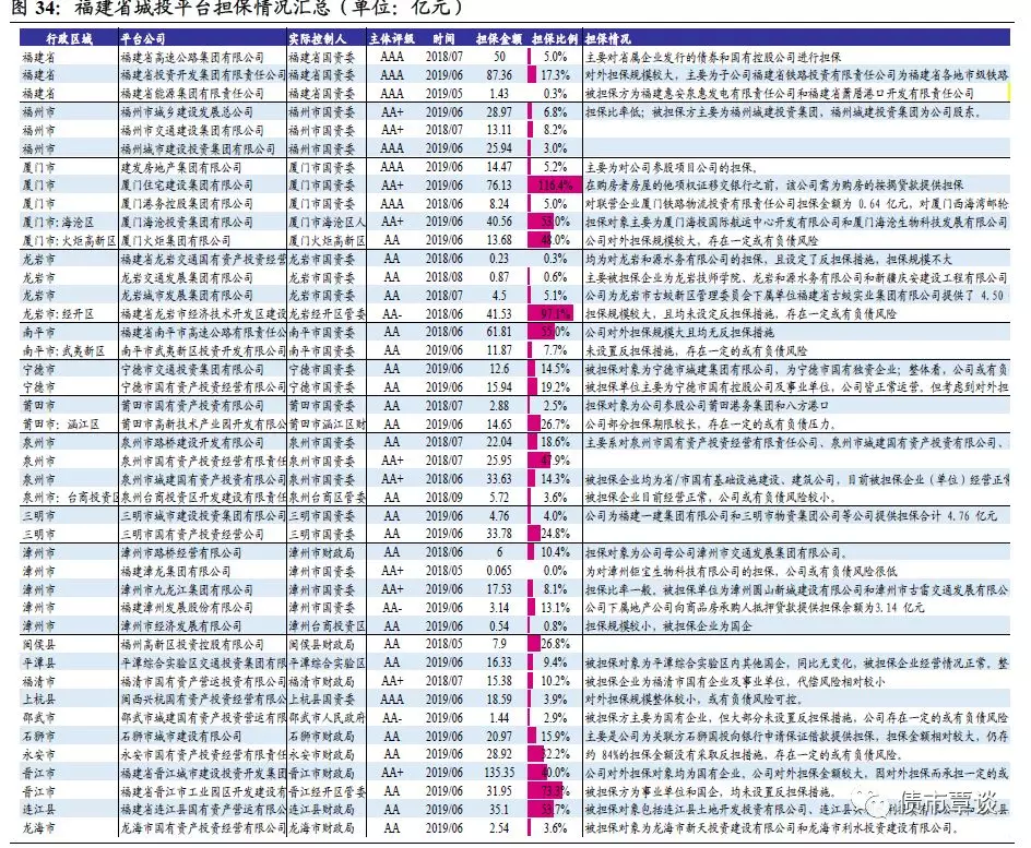 我们根据最新2018年半年报、评级报告等梳理了福建省各地市级平台担保情况,总体上福建城投平台担保比率不高,面临的或有担保风险相对可控,总结情况如下表所示: