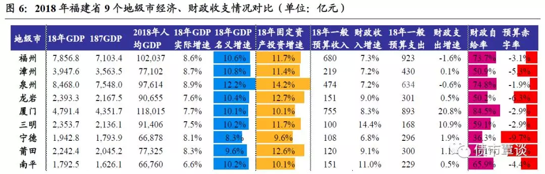 从地方财政实力来看,①厦门市财政实力最强,18年一般预算收入为745.5亿元,占全省25%,其次是福州市680亿,泉州、漳州市预算收入在200亿以上,其余地市多数在100-200亿区间,宁德市最低仅为108亿。②以“一般预算收入/支出”衡量的财政自给率看,厦门、泉州、福州最高在70%以上,宁德、莆田市最低仅为36.3%和40.1%;③以“(地方预算收入-支出)/GDP”衡量的预算赤字率看,福建省各地市整体预算赤字率较低,仅宁德市、莆田市预算赤字率较高,分别为-9.7%和-8%。