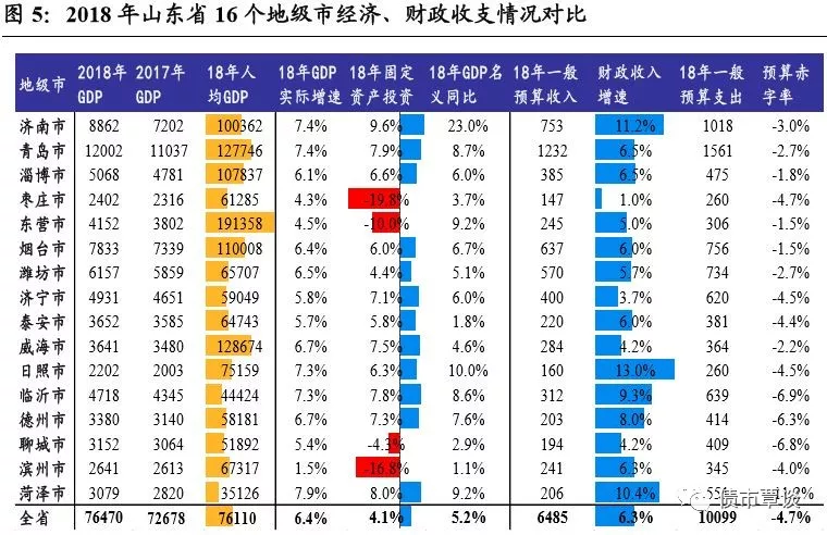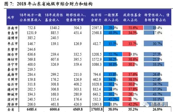从地方综合财力和来源结构看,①济南和青岛综合财力不相上下,远超其他地市,地方综合财力超2500亿,超出第三名烟台市1300亿;②山东整体对于上级补助转移性收入、债券转贷收入等依赖性较低,全省层面占比为27%,一般预算收入占比为38%。其中,青岛、烟台、滨州市财政自给率相对较高,一般预算收入占40%以上,菏泽市最低,为18.8%,显示自身造血能力较差;③济南、潍坊、威海、日照、德州、菏泽等18年政府性基金收入规模超过一般预算收入,显示对土地出让收入依赖性较强。④聊城市的转移性收入、债券转贷等占比超过40%,显示对上级转移支付依赖性较强。