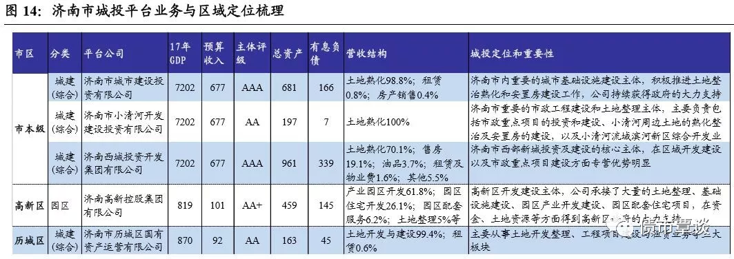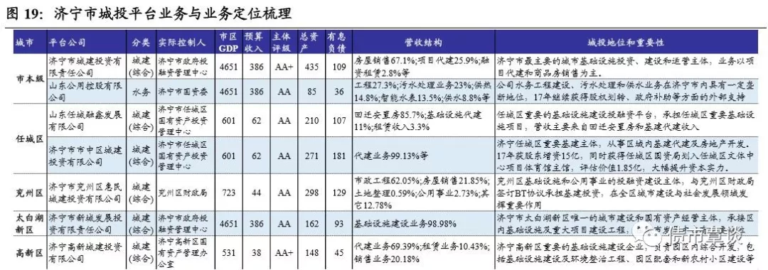 济宁高新区:1992年成立,2010年升级为国家级高新区,主要产业为工程机械、汽车、生物医药等,17年高新区GDP为531亿,名义增速8.37%。区内唯一核心平台为济宁高新城建投资公司,负责产业园综合开发、基建投资及国有资产经营,业务具有专营性,资产148亿。
