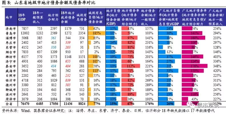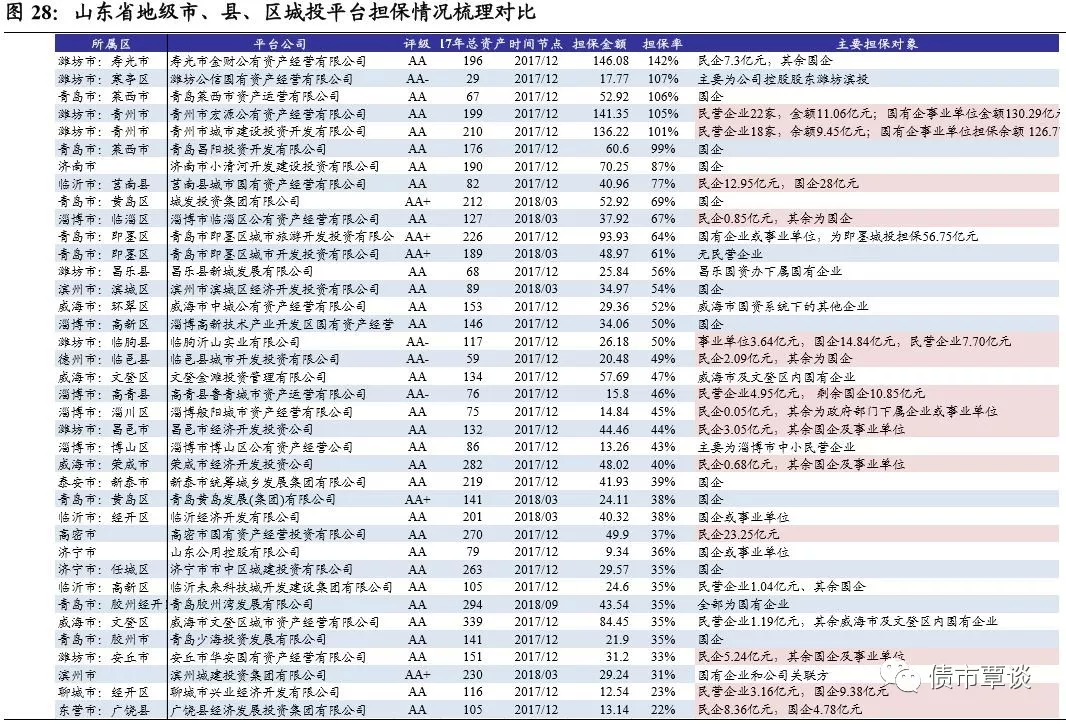 我们根据2018年半年报、2018年评级报告等梳理了山东省各地级市平台担保情况。其中,部分区县平台担保比率较高,且对民营企业有一定担保敞口,面临较大或有风险。总结情况如下表: