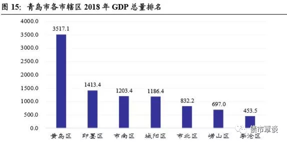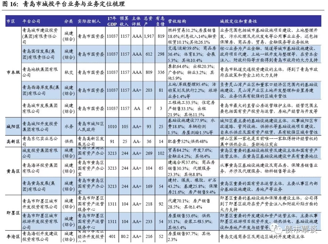 黄岛区:也称西海岸新区,是我国第九个国家级新区。面积2096平方公里,人口171万人,经济水平稳居山东省市辖区第一,17年GDP为3213亿,同比增长16.2%,固定资产投资2262亿。区内基建和国有资产运营平台有3家,城发投资集团、青岛海洋投资集团和青岛黄岛发展(集团)公司,主要从事基础设施建设和房地产等业务。3家平台总资产规模较小,在100-300亿区间。