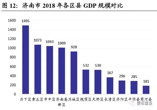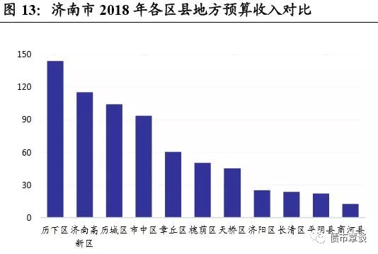 历城区:地处济南东部,18年GDP为900亿,增长7.8%,一般预算收入102.8亿,同比13.7%,固定资产投资增长20%。历城区重点税源企业有山东济南烟草公司、济南中海城房地产公司、中铁置业集团济南公司等。区内唯一核心城投平台是济南市历城区国有资产运营公司,是区内重要的基础设施投融资主体,具有重要地位,公司财富创造能力主要依赖土地开发与整理、工程项目建设等,总资产163亿。
