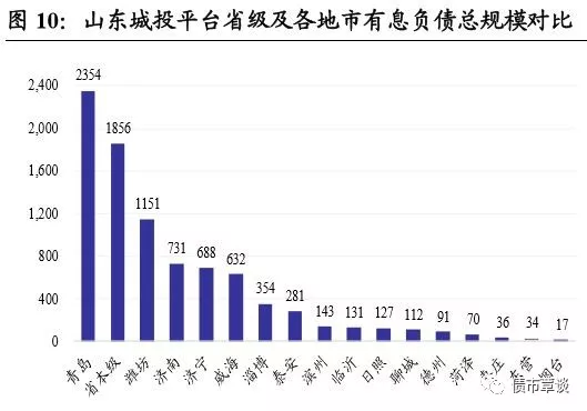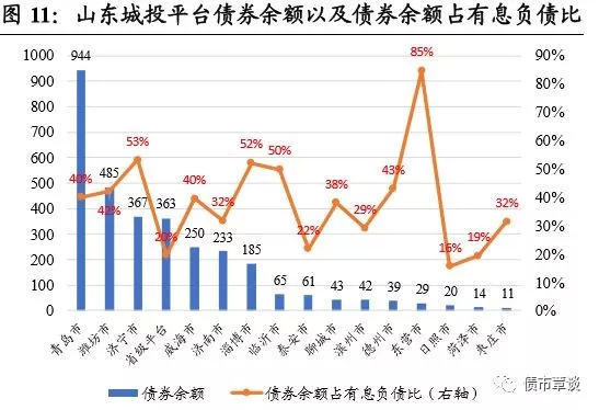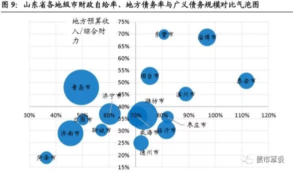 从地方债务率水平看,以“地方债务余额/GDP”衡量的地方负债率全省平均在15%,潍坊市、临沂市、滨州市相对较高;以“地方债务余额/地方综合财力”衡量的地方债务率,全省总量在67%,泰安市、淄博市、滨州市、临沂市、枣庄市和东营市均在80%以上,相对较高;如果仅以“地方债务余额/地方一般预算收入”这一最狭义口径来看,则德州市、临沂市、枣庄市、泰安市、潍坊市这一比例超过200%。