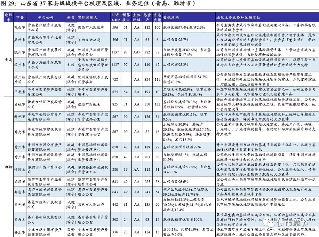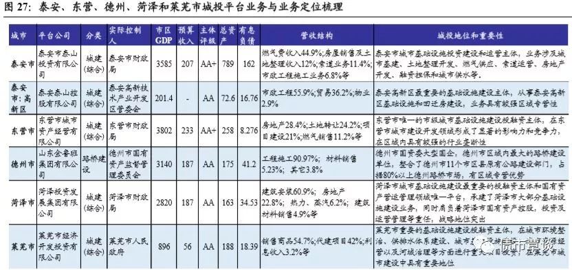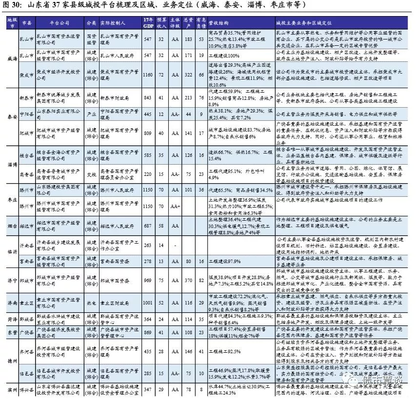 山东省17个地级市城投平台梳理。我们对各市级、市区级平台进行分类和梳理,以把握各市区平台数量、排序、业务和专营区域范围,以利于筛选核心城投平台。
