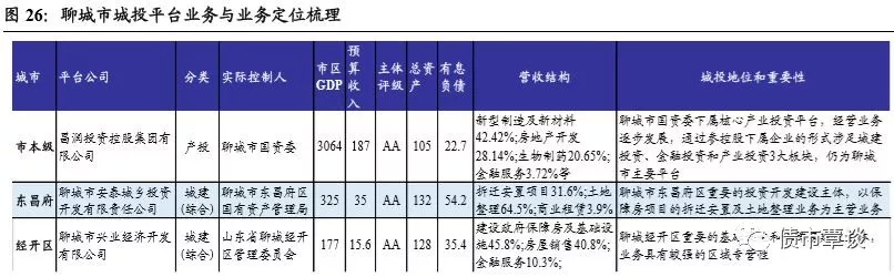 聊城市市级平台有3家,市本级平台为昌润投资控股集团,为市政府授权的市级国有资产运营机构,总资产105亿;东昌府区有1家区级平台,即聊城安泰城乡投资开发有限公司,负责区内基建和保障房建设,资产规模132亿;聊城经开区在2013年升级为国家级经开区,区内核心平台为聊城市兴业经济开发有限公司,从事经开区内基础设施和保障房建设、金融服务等,具有较强区域专营性,总资产128亿。
