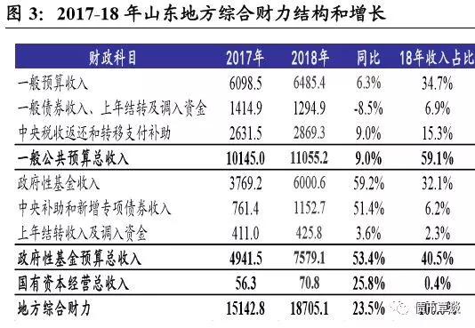 从地方财政实力看,青岛市财政实力最强,18年一般预算收入为1232亿,其次济南、烟台和潍坊市也均在500亿以上;淄博、济宁、临沂、和威海市财政收入在250-500亿区间,而枣庄市财政收入不足150亿,地方财力相对较弱。从地方财政收入增速看,济南、日照和菏泽市增速迅猛,均在10%以上,枣庄市增速为1%,增长乏力。以“(地方预算收入-支出)/GDP”衡量的预算赤字率看,菏泽市、临沂市、聊城市分别为-11.2%、-6.9%和-6.8%,财政自给能力偏弱,对上级转移支付等依赖性较高。