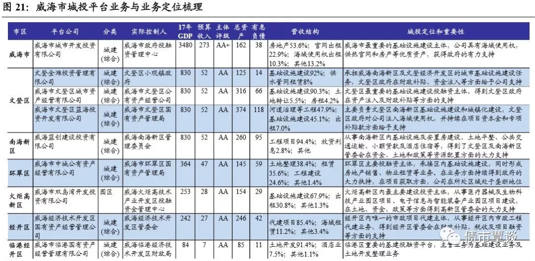国家级开发区:环翠区共有3个国家级开发区——经开区、临港区和高新区。3个开发区各1家城投主体,负责所在区域的基础设施及安置房建设、土地开发整理和产业园区建设。