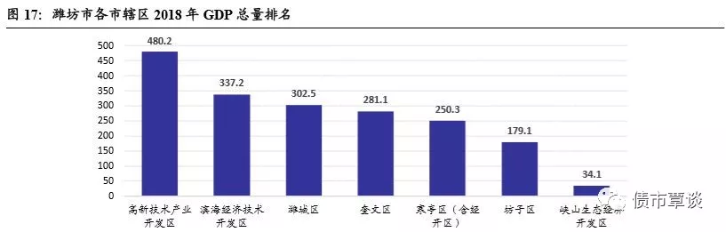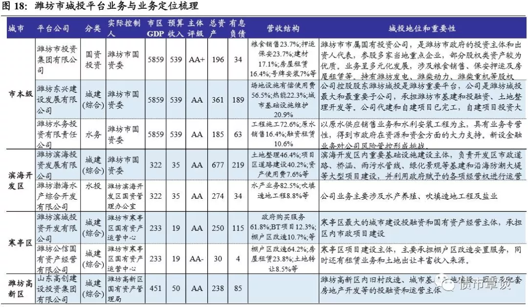 潍坊高新区:1992年经国务院批准设立的54个国家级高新区之一,是潍坊市政治经济中心,市委、市政府所在地,面积116平方公里。18年GDP为480.2亿。区内目前唯一有存量债平台为山东高创建设投资集团,资产85亿,主要承担高新区内旧村改造、城市基建、园区及配套房地产开发等。