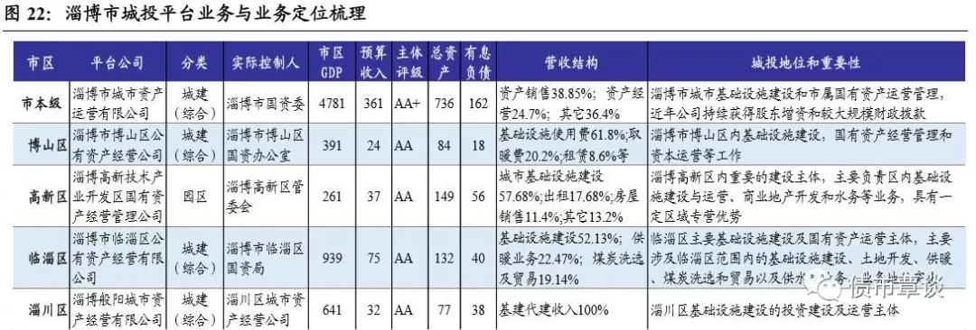 临淄区:地处淄博东北部,面积663.68平方公里,人口64.28万人,临淄区经济总量在淄博各市区中位居前列,17年GDP为938.8亿,同比6.5%,固定资产投资470.5亿,同比1.7%。区内基建和国有资产运营平台为临淄区公有资产经营有限公司,从事区域内基建、土地开发、供暖、煤炭以及供水等业务,总资产132亿。