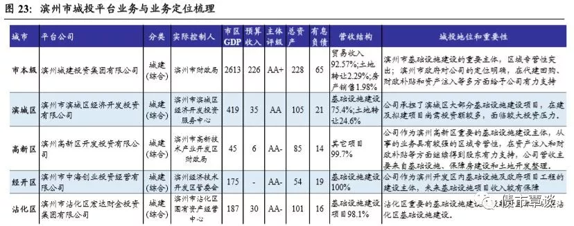 市本级唯一核心发债平台为滨城城建投资集团,为市政府主要基础建设投资主体,目前重点投资领域集中在市政及道路建设,未来向多元业务板块的城市运营商转型,存量项目有限,17年收入主要由贸易收入构成,总资产226亿。