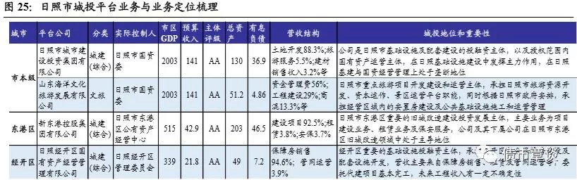 日照市市级平台有4家,市本级核心平台是日照市城市建设投资集团,承担日照市基础设施建设开发,经营和运营城建资产,总资产130.2亿;还有1家山东海阳文化旅游发展公司,负责日照重点旅游项目开发建设和运营,资产仅51.2亿。东港区有1家区级平台为新东港控股集团,负责区内旧城改造和项目建设,资产达203亿;日照经开区有1家城投主体,为日照经开区国有资产经营管理公司,负责经开区基础设施投融资和保障房建设,总资产仅49亿.