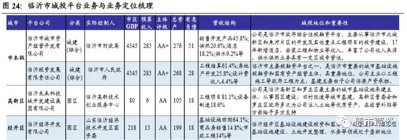 临沂经开区:于2003年建设,2010年升级为国家级经开区,规划面积223平方公里,人口26万人,以智能制造、新兴产业、医药健康为三大主导产业。2018年GDP为242亿,同比增长9.3%,实现公共财政预算收入14.9亿,增长11.2%。区内唯一核心平台是临沂经开,负责经开区内基础设施投资和国有资产运营,在基建、土地开发整理、水务等领域具有垄断地位,总资产199亿.