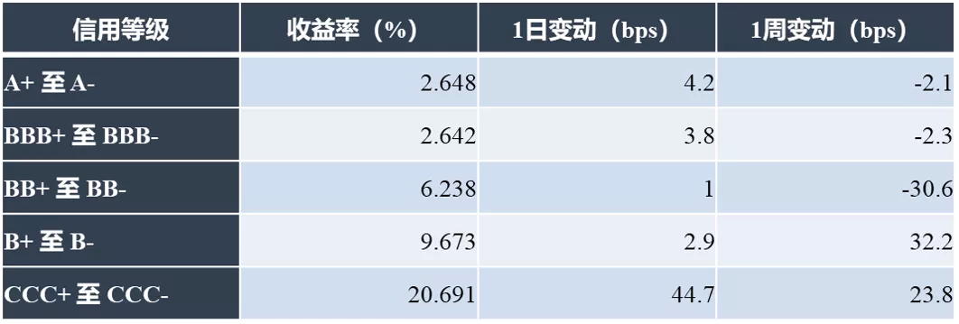 9月5日,二级市场整体走弱,各等级名字不同幅度下跌,投资级名字中,A、BBB等级收益率上行约3.8bps~4.2bps;高收益名字中,CCC等级大跌,收益率上行近44.7bps,BB、B等级跌幅较小,收益率分别上行1bps、2.9bps左右。城投板块投资级、无评级名字小有下跌,收益率上行约2bps~3bps。地产板块全面下跌,高收益名字中,CCC等级跌幅明显,收益率上行近34.1bps,BB、B等级跌势稍缓,收益率分别上行约5.7bps、2.9bps;投资级、无评级名字亦有较差表现,收益率上行4.7bps~5.5bps左右。