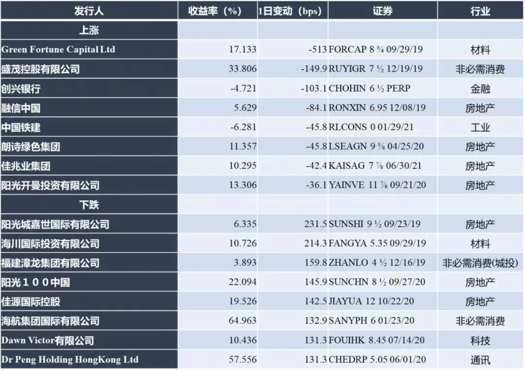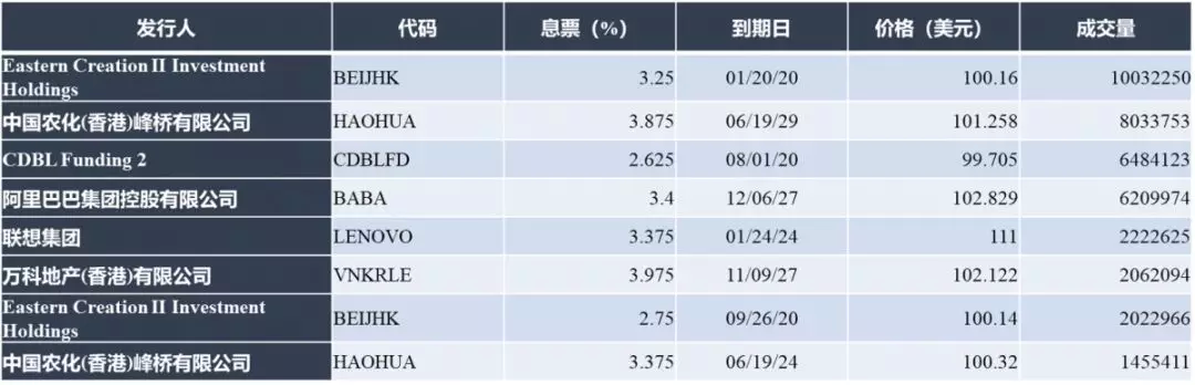 今日交易活跃债券名字BEIJHK 3 ¼ 01/20/20(Eastern Creation II Investment Holdings),HAOHUA 3 ⅞ 06/19/29(中国农化(香港)峰桥有限公司),CDBLFD 2 ⅝ 08/01/20(CDBL Funding 2)。