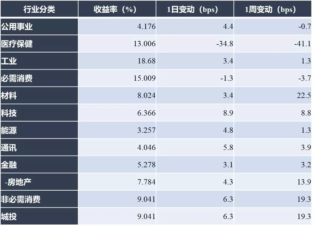 行业方面,除医疗保健、必需消费板块上涨外,其余板块全面下跌,尤以科技板块、非必需消费板块跌幅最为明显。科技板块主要受北大资源集团(Dawn Victor有限公司)等名字下跌的影响,收益率上行约8.9bps;非必需消费板块主要受福建漳龙集团、海航集团等名字下跌的影响,收益率上行6.3bps左右。