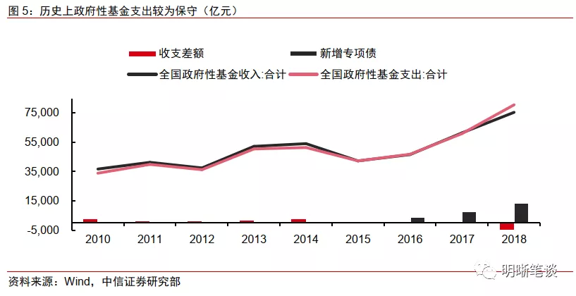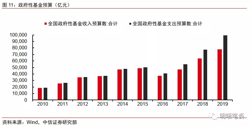 政府性基金“赤字”可用专项债弥补。即使将地方政府隐性债务纳入考虑,中国的政府债务在国际对比中也并不突出,地方政府还有一定的杠杆空间。中央对地方债务的限制,更多的是希望将地方债务摆上明面,限制其野蛮生长,对专项债实则是相对积极的态度。地方政府专项债自2015年公布新增额度以来,额度的增长速度十分可观,按照时间顺序分别为1000亿元、4000亿元、8000亿元、13500亿元、21500亿元。再加上政府对明年专项债发行的重视,说明专项债或许能够在将来发挥更大的作用。另一方面,财政本身对政府性基金“赤字”并不排斥,历年的预算数中就有所体现,2019年的政府性基金预算“赤字”约为2.19万亿元,与新增专项债额度2.15万亿相近,说明财政对于政府性基金的“赤字”已经有所安排。因此,在明年政府性基金支出需求大,收入来源弱的情况下,新增专项债额度将继续增加。