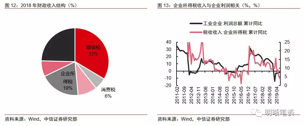 税收或有小幅增长的余地,主要考虑企业所得税收入反弹和国企利润上缴。企业所得税是全国财政收入中除增值税以外最大的税种,2018年的收入为3.53万亿元,占2018年全年财政收入的19%。企业所得税主要由企业的毛利决定,工业企业利润与财政企业所得税收入之间有较强的相关关系。考虑到当前企业利润增速已经进入磨底状态,在逆周期调节之下,明年反弹概率较大,财政的企业所得税收入将会有所改善。另一方面,2018年国有企业利润总额约为3.39万亿元,如果适当上调部分企业的利润上缴比例,也能为财政提供一定的增量资金。用2018年的收入水平考虑这两项收入的量级,如果2020年企业利润回升至10%以上,再从国有企业中多抽调一些利润,这两项带来的预算收入增量或可到达0.5万亿。
