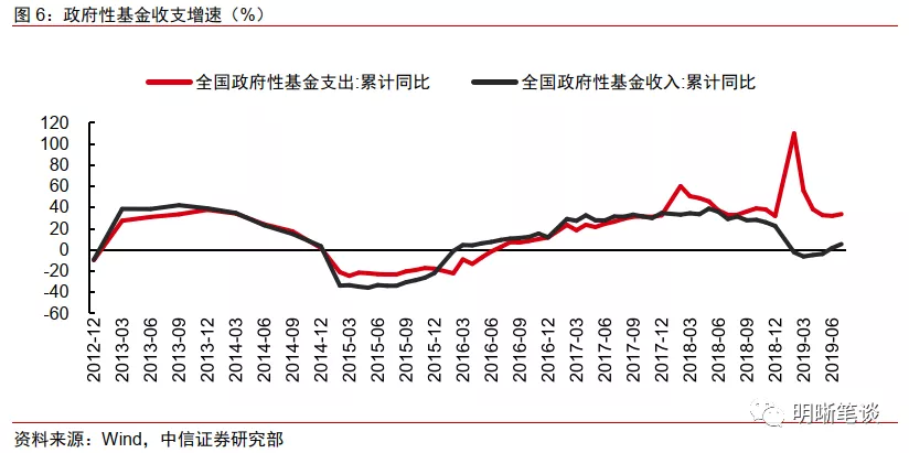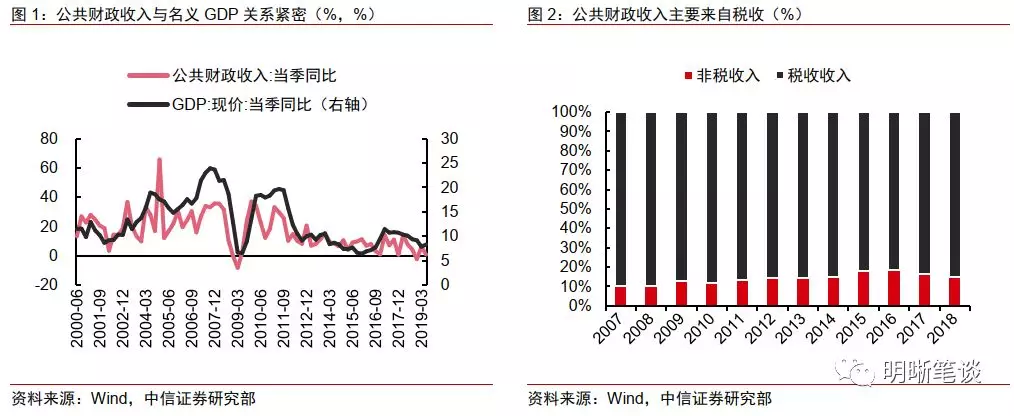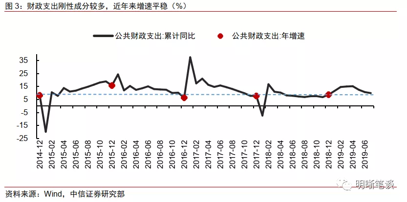 公共财政收入:主要受名义GDP和减税影响。由于公共财政收入的主要来源是税收收入,大多数年份占比超过85%,而税收收入是公共财政参与国民收入分配的结果。从这个角度来看,税收收入的多少主要与国民收入(名义GDP)以及分配比例(税率)有关。从图1中我们可以看到,公共财政收入与名义GDP同比增速趋势相关,其中财政收入增速的波动更加频繁,主要受到分配规则调整、经济结构变化或者其他扰动因素的影响。由于今明两年实际GDP大概率稳在6%附近,名义GDP或将随通胀小幅下滑,在税率不再继续下调的假设下,考虑到今年1-7月公共财政收入累计同比增速为3.1%,如果我们按照今明两年2.5%的复合增速对明年的收入进行估计,预计2020年公共财政收入将达到19.3万亿元。