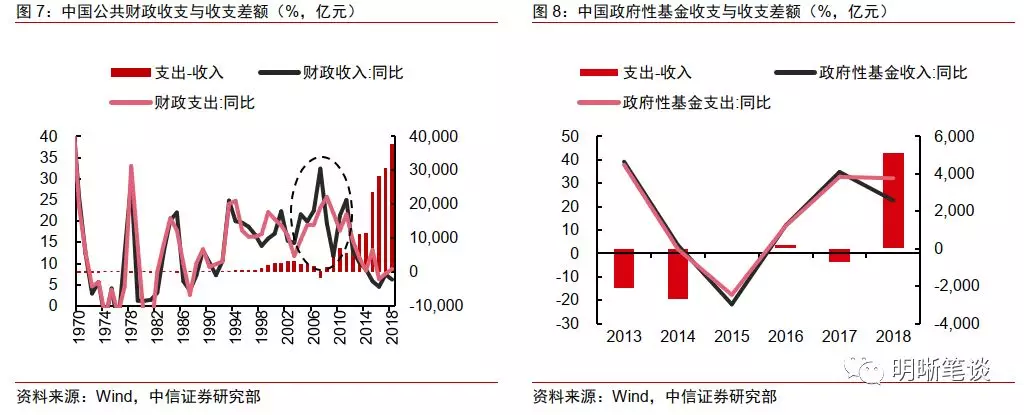 长期来看,财政总体上是按照以收定支,收支相抵的原则在运作。从财政预算中与实体经济联系较为紧密的公共财政预算和政府性基金预算两笔账来看,每年财政收入与支出的增速长期的走势高度相符,过去财政的收支差额也保持在较小的水平。近年来,自2008年全球经济危机开始,人口红利、追赶效应等经济增长的加成因素都在不断弱化,经济逐渐步入新常态,需求增速开始下滑,使得财政不得不增加赤字支出的力度,收支增速的波动在近十几年也相对较大。