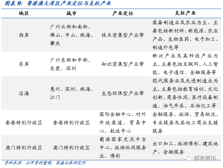 产业结构方面,粤港澳大湾区产业结构相对均衡,电子信息产业与装备制造业蓬勃发展,拥有华为、腾讯等全球著名科技公司。粤港澳大湾区一般分为西岸、东岸、沿海及港澳地区。其中,西岸以发展技术密集型的高端制造业为主、沿海以生态保护型的现代服务业为主、而东岸则以知识密集型的新经济为主。